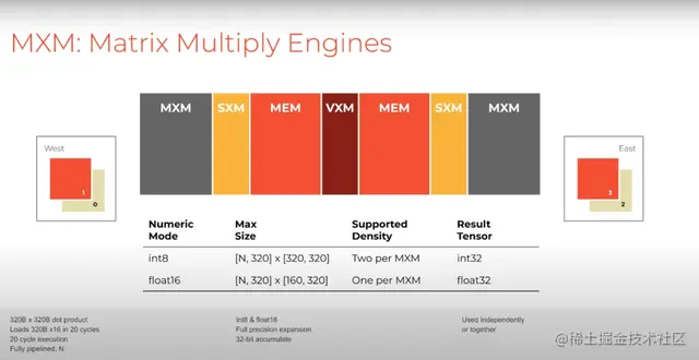 芯片的核心是矩阵乘法单元。矩阵引擎通过具有320个元素的向量进行操作,每个矩阵中有320个特征,提供320x320整数运算。对于浮点运算,我们可以做320x160,可以同时处理整数和浮点数。浮点有点独特,因为一对字节平面(byte planes)协作产生一个FP16的输出。