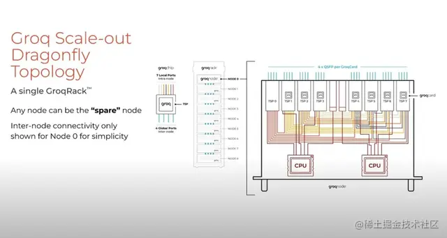 Groq的横向扩展拓扑使用蜻蜓拓扑来完全连接机架内的八个全局节点集,如下图所示。