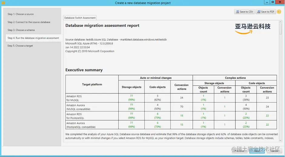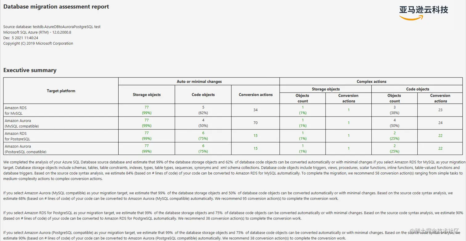选择 Next(下一步),SCT 将运行数据库迁移评估。评估将提供有关不同数据库引擎之间迁移模式复杂程度的详细信息,如下图 7 所示。