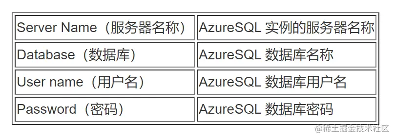 请确保将以上加粗斜体示例值替换为与您的具体 AzureSQL 数据库关联的值。