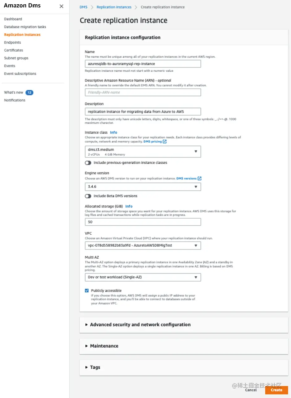 步骤 5:创建 Amazon DMS 复制实例导航到亚马逊云科技管理控制台,登录您的亚马逊云科技账户,然后在搜索栏中输入 Database Migration Service。选择 Database Migration Service 结果,然后系统会将您转到 Amazon DMS 页面(参见下图 14),在该页面中,您将选择 Create replication instance(创建复制实例),然后以下表中的信息作为指导完成设置: