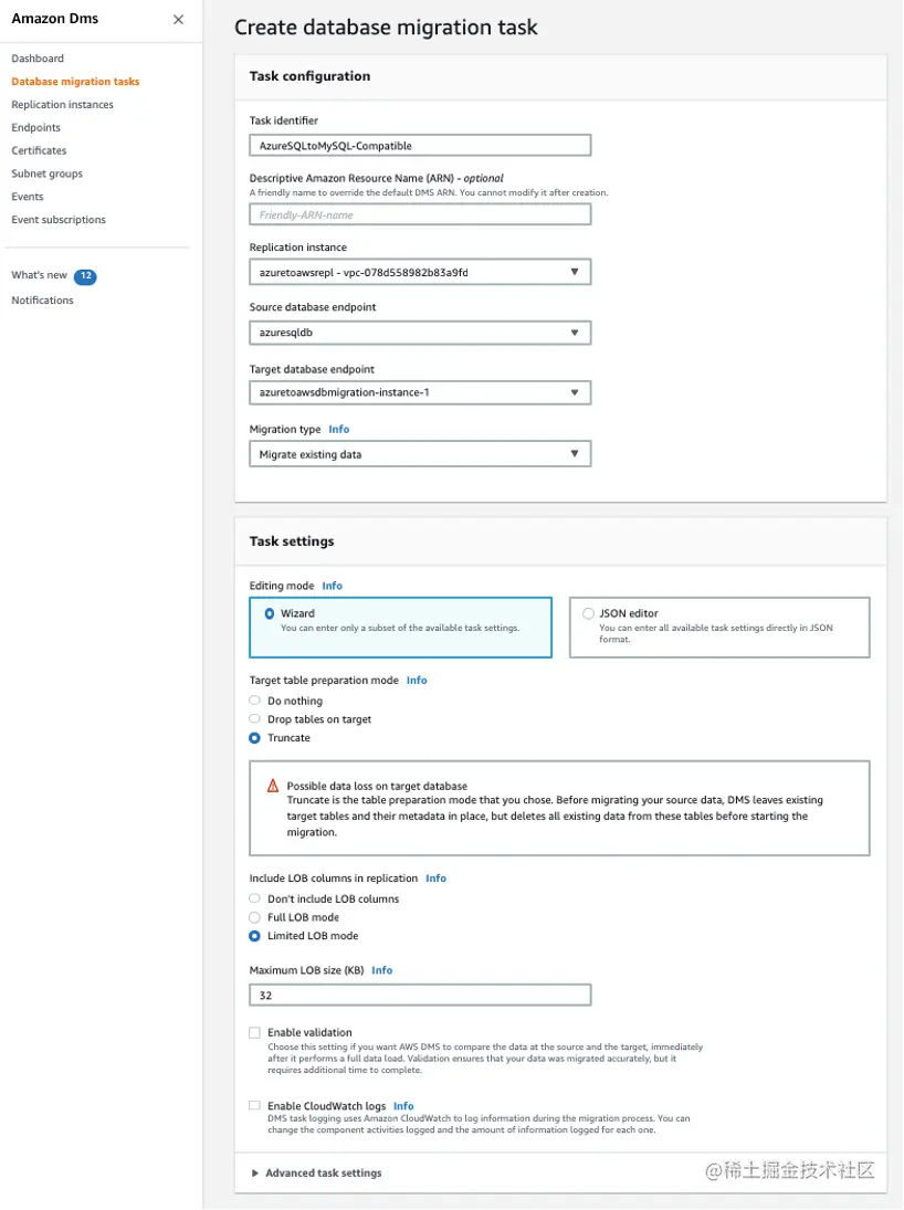 登录到亚马逊云科技管理控制台后,导航到 Database Migration Task(数据库迁移任务)并选择 CREATE TASK(创建任务)以创建以下任务,如图 18 所示。