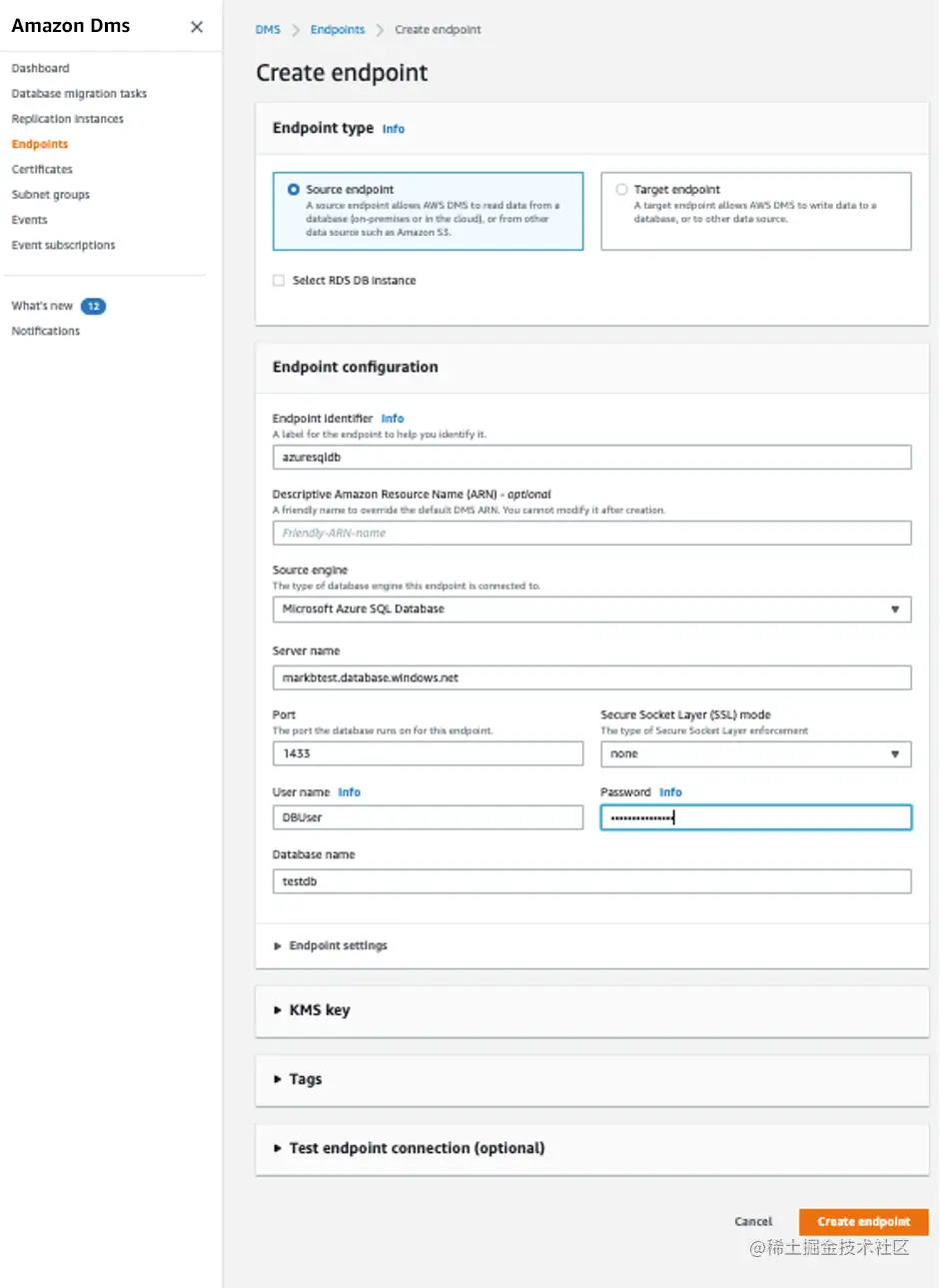 步骤 6:定义 Amazon DMS 终端节点登录亚马逊云科技管理控制台后,导航到 Amazon DMS 并选择 Endpoints(终端节点),然后创建以下源终端节点: