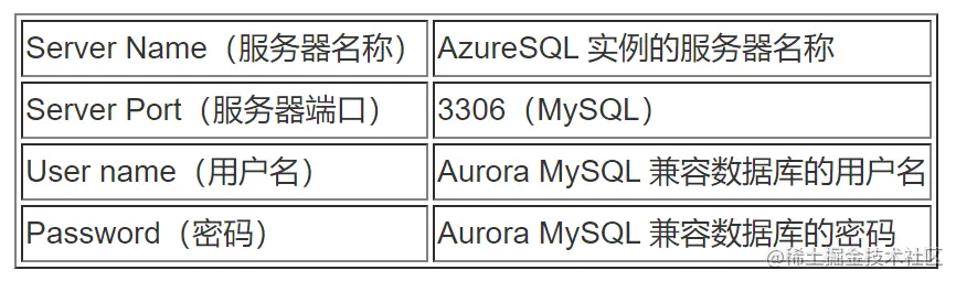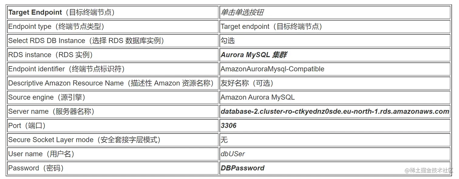 请确保将以上加粗斜体示例值替换为与您的具体 Amazon Aurora MySQL 兼容数据库关联的值。