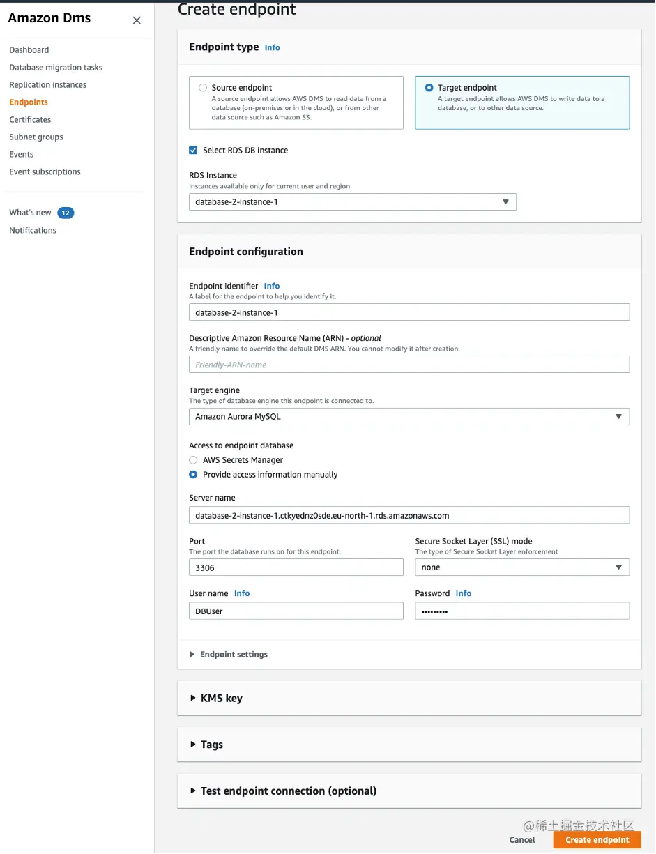 登录亚马逊云科技管理控制台后,导航到 Amazon DMS,选择 Endpoint(终端节点),然后创建以下目标终端节点: