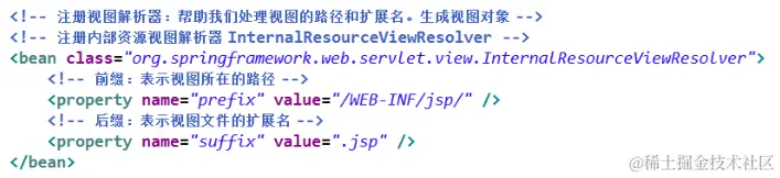 SpringMVC 框架为了避免对于请求资源路径与扩展名上的冗余,在视图解析器InternalResouceViewResolver 中引入了请求的前辍与后辍。而 ModelAndView 中只需给出要跳转页面的文件名即可,对于具体的文件路径与文件扩展名,视图解析器会自动完成拼接。