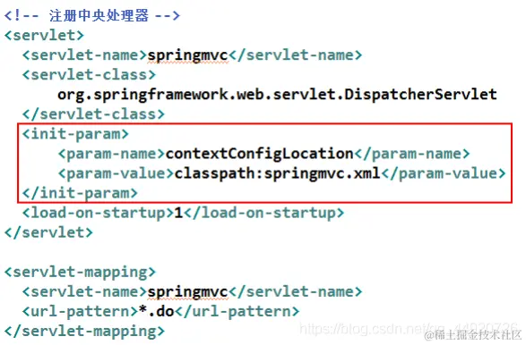 而一般情况下,配置文件是放在类路径下,即 resources 目录下。所以,在注册中央调度器时,还需要为中央调度器设置查找 SpringMVC 配置文件路径,及文件名。