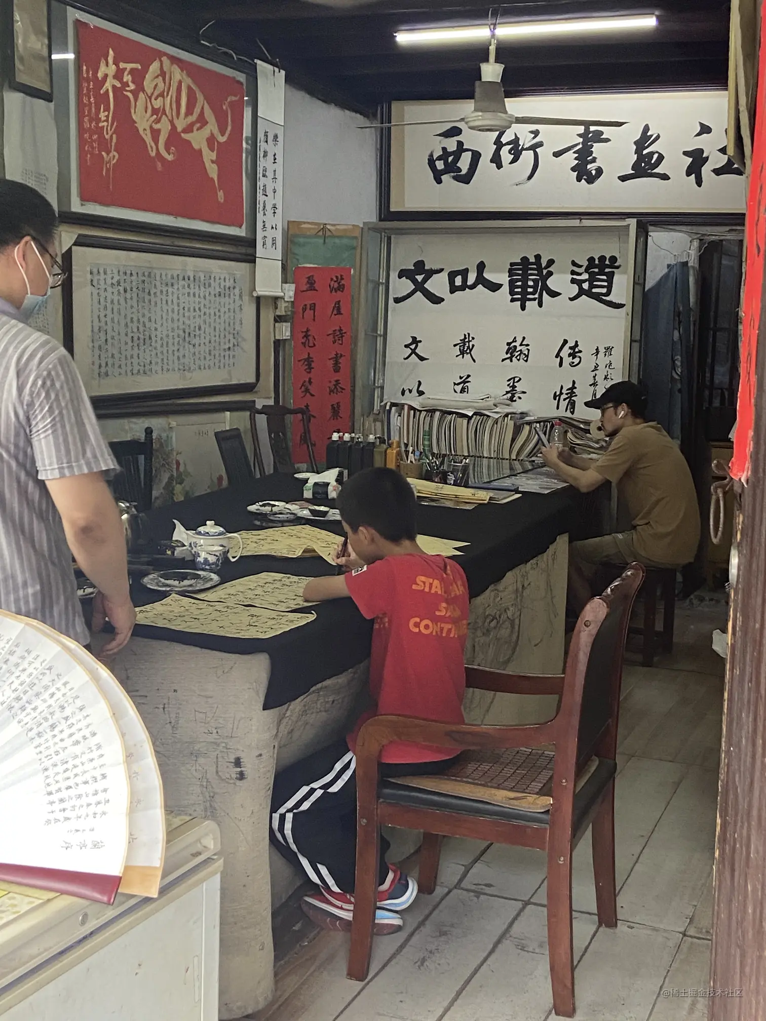 画面来到书圣故里的路上,有鲁迅小学,继续往前是一条到了下午2点都还依旧热闹的集市,我的理解:儿时老家集市的放大版。沿路看到了现代版的"骆驼祥子",纯人力骑着蓝色的三轮车,载着旅客,奔走来拥挤的小巷子,路边小猫咪慵懒的趴在路边的石板路上,大树下倚躺在靠椅的是一位头发花白的老奶奶...时间来到我踏入故里最中央的时刻,你看,那边的桥上很多身披汉服和马来褂的小姐姐,在摄影师的支配下记录着他们青春最美的样子,左右看,在巷子深处可以看到不同的客栈,沿路的老人提着赶集的成果向前方向走去,这样的生活状态,复活了我脑子悠久且仅有的一点的记忆,那个时候爸妈、奶奶去河边洗衣服,摆拖把的情形。走到了墨池,旁边一个口齿不那么清晰的摆摊的男人,他的年龄应该和我相仿,吸引了我的注意,我到他摊位前,他支支吾吾的说,那边的简画是他做的,强调了很多遍,可我看中的是他面前王羲之的折叠扇,临走之前我竖起大拇指看着他,也许他也理解了我给他的一点善意,他回之以微笑,也是这些慢慢的治愈着我,这应该就是旅行的意义吧,看遍生活百态,最后回归自己安安静静的轨道。沿路我注意到一家书法社-西街书画社,有一个小女孩和一个小男孩在认真的拿着毛笔写着书法,一个戴着眼镜的大叔指导着他俩,场面一度让我羡慕,心里话。阳光暴晒的墨池,里面的水是不是真的加了一点点墨水呢?稍微颜色相较黑了点。辗转在小巷子,迟迟没看到书圣的祠堂或者纪念堂,问了当地的阿姨,它说就是在墨池对面的寺庙中,我寻思寺庙为什么跟王羲之扯上关系?原来以前贫寒的书生学习的场所大多在寺庙,终究是吃了没有文化的亏!进去后里面的人很少,我很不解,书圣故里不去看书圣都去看啥?是被江南的小姐姐迷住了吗?hahahaa,寺庙的最深处是一个气势宏大的庙宇,满满的天竺气息,还没彻底翻新完工的建筑肉眼可见。工人正在设计摆蜡烛的架子,忙忙碌碌,只有我,悠哉游哉。