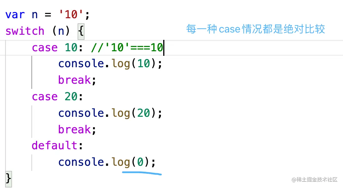 在switch case 中,条件判断 其实是三个===,绝对等于,不仅要值相同,类型也要相同,所以才会出现上面不同的情况。