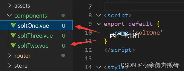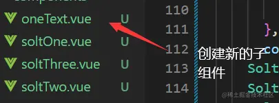 首先创建两个子组件,soltOne是基础使用,soltTwo是域名插槽使用,soltThree是演示父组件获取子组件内容,图片后的代码一定要注意,容易出现很多细节上的小问题。