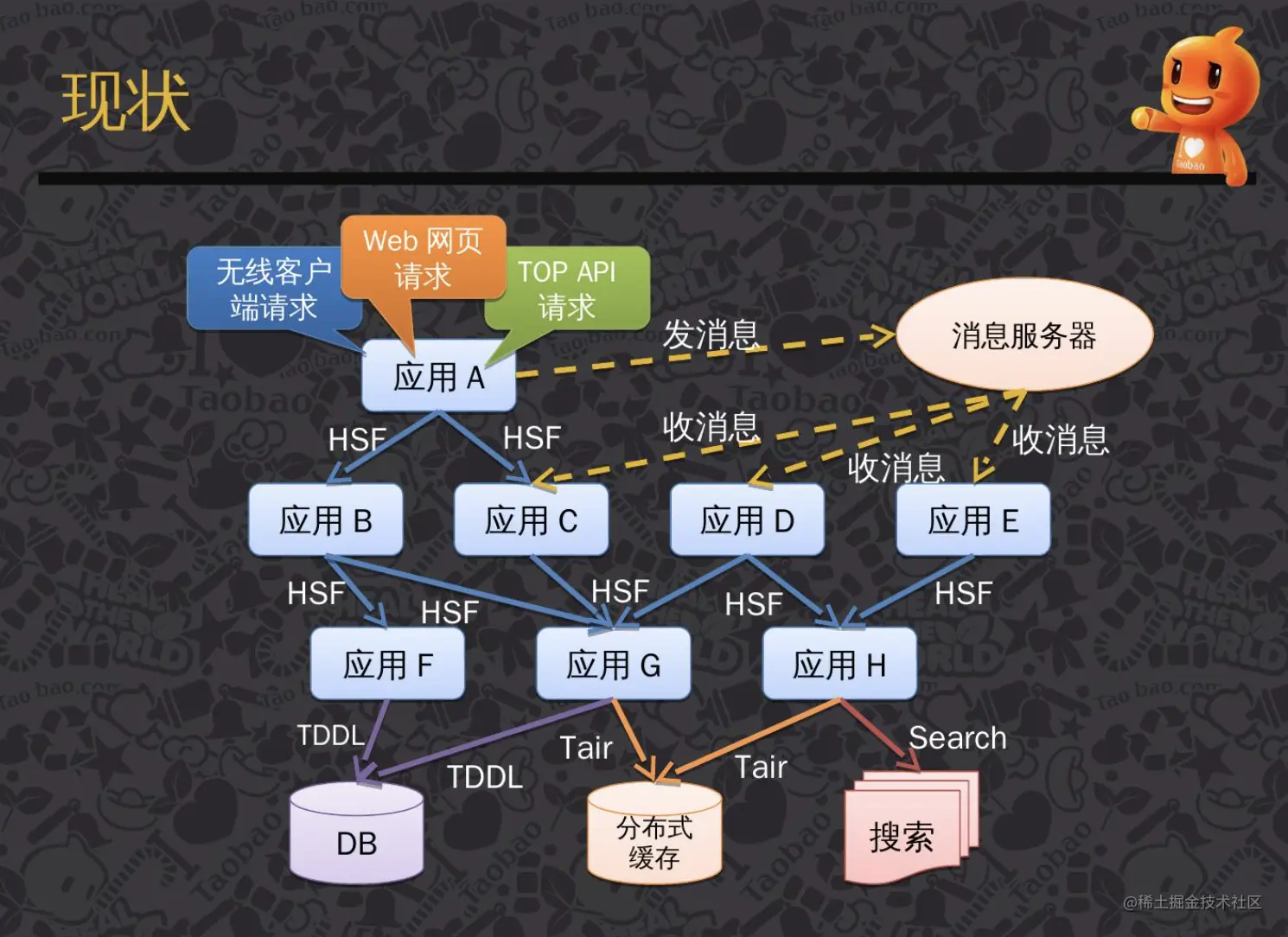 而在分布式服务中,各个大厂内部系统成百上千的,链路关系更加复杂。比如你在外卖平台上的一个点击请求可能跨了内部几十个Java应用了,在这么长的链路里去排查问题,没有好使的工具怎么行呢。如图是当前分布式系统的现状,图片来源:鹰眼下的淘宝分布式调用跟踪系统介绍