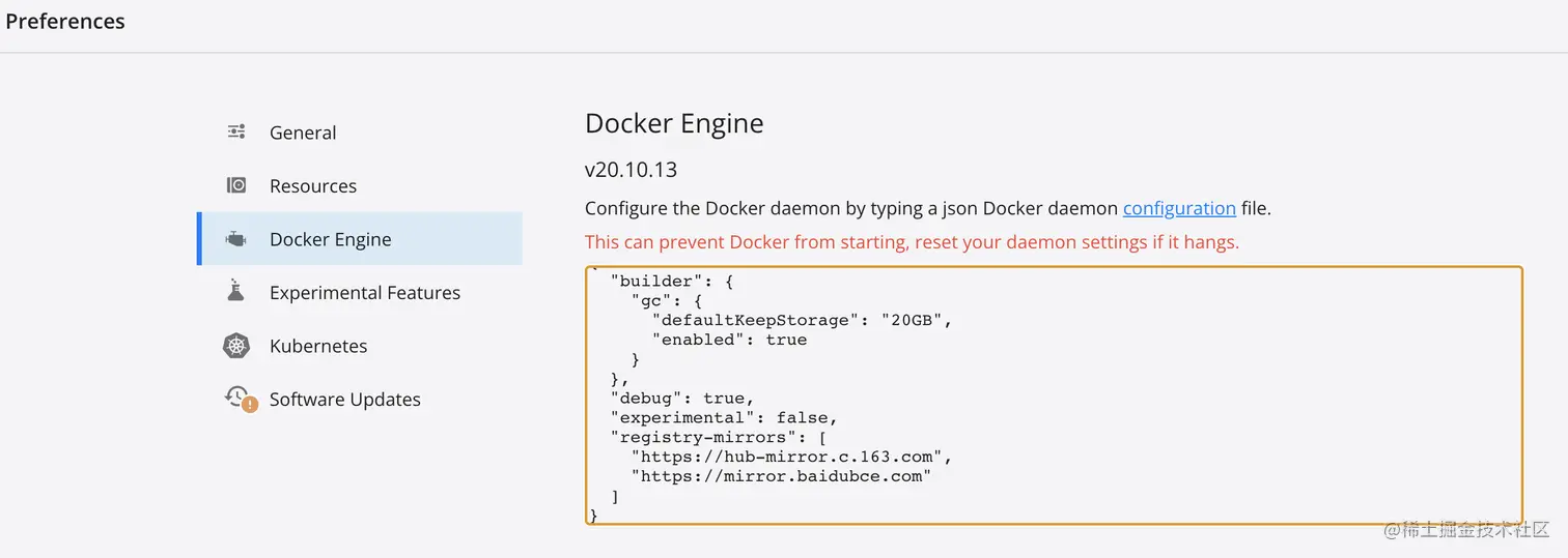 Docker桌面版Preference -> Docker Engine 在Json配置里加上,加好之后重启Docker,然后再重新拉镜像,速度立马快得飞起🚀🚀🚀
