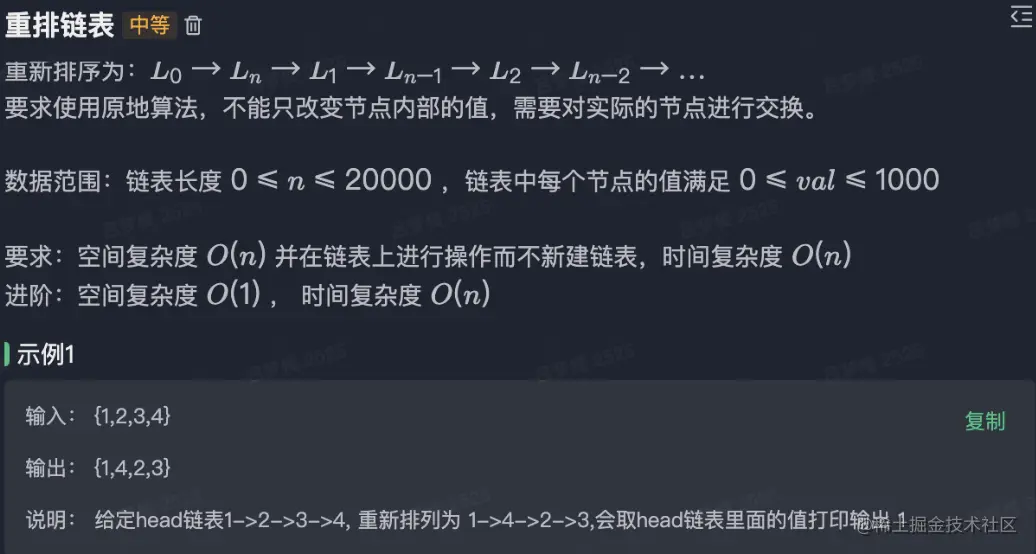 对于一面,算法必须是我们重点考察的内容,面试官一般会出 1-2 道中等难点系数的算法题,时间不超过 35 分钟,比如重排链表。