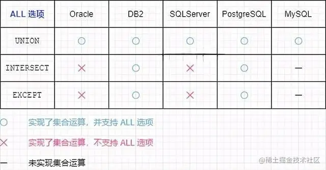 加上 ALL 可选项是一个非常有效的优化手段,但各个数据库对它的实现情况却是参差不齐,如下图所示