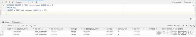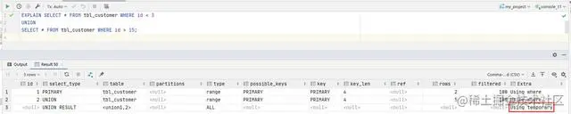 所以如果我们不在乎结果中是否有重复数据,或者事先知道不会有重复数据,可以使用 UNIONALL 代替 UNION试下,可以看到,执行计划中没有排序运算了
