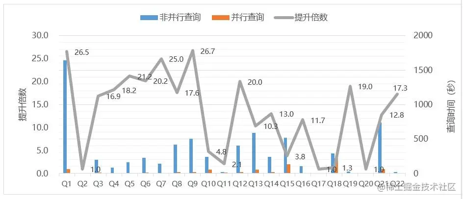下图是GaussDB(for MySQL)并行查询针对TPC-H的22条查询场景所做的性能测试结果,测试数据量为100G,并发线程数据是32。下图展示了并行查询相比传统MySQL单线程查询的性能提升情况:32并行执行下,单表复杂查询最高提升26倍性能,普遍提升20+倍性能。多表JOIN复杂查询最高提升近27倍性能,普遍提升10+倍性能,子查询性能也有较大提升;