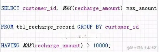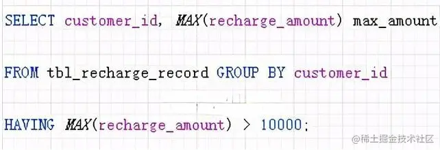 例如: SELECTMAX(recharge_amount) FROM tbl_recharge_record