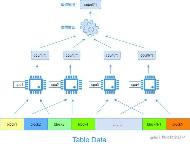 下图是使用CPU多核资源并行计算一个表的count()过程的例子:表数据进行切块后分发给多个核进行并行计算,**每个核计算部分数据得到一个中间count()结果**,并在最后阶段将所有中间结果进行聚合得到最终结果