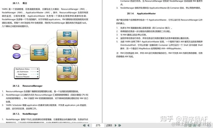 YARN 是一个资源管理、任务调度的框架,主要包含三大模块:ResourceManager(RM)、NodeManager(NM)、ApplicationMaster(AM)。其中,ResourceManager 负责所有资源的监控、分配和管理;ApplicationMaster 负责每一个具体应用程序的调度和协调;NodeManager 负责每一个节点的维护。对于所有的 applications,RM 拥有绝对的控制权和对资源的分配权。而每个 AM 则会和 RM 协商资源,同时和 NodeManager 通信来执行和监控 task。
