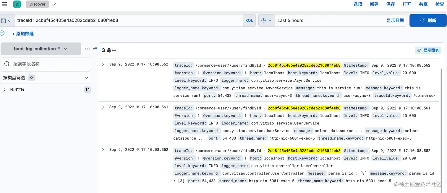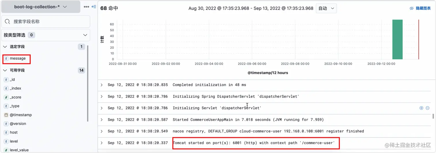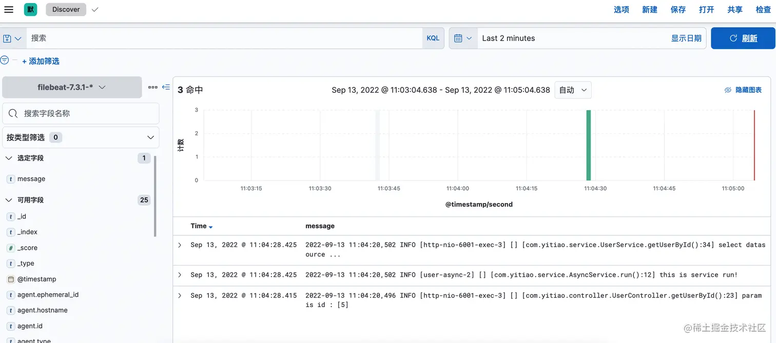 这时启动应用,观看 Logstash 的控制台,会跟着打印日志,再打开 ES ,创建我们配置好的查询索引,神奇的事情发生了,日志一条一条的展示出来。