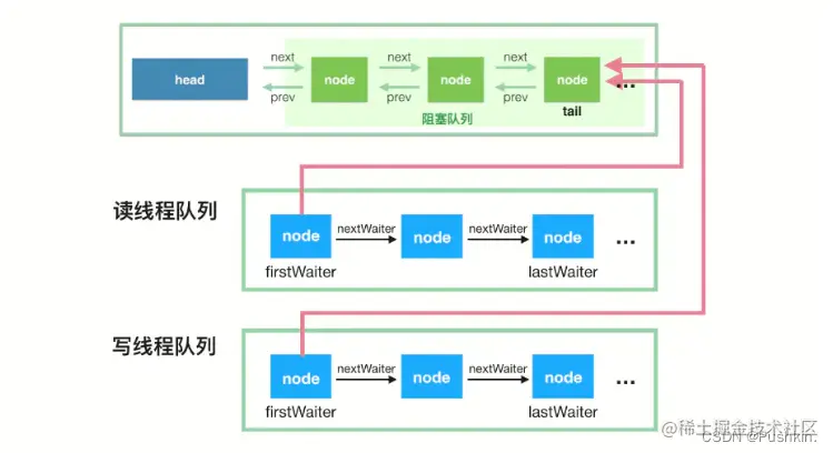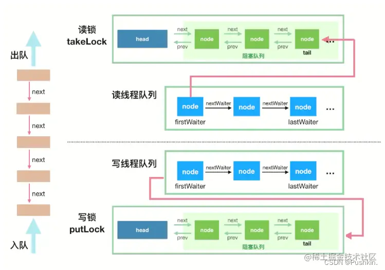 LinkedBlockingQueue使用双锁可并行读写,其吞吐量更高。