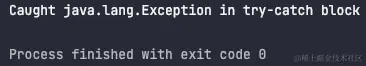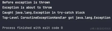 fun main() { val exceptionHandler = CoroutineExceptionHandler { _, exception -> println("Top-Level CoroutineExceptionHandler got $exception") } val coroutineContext = Dispatchers.Default + CoroutineName("ExceptionHandler")+exceptionHandler CoroutineScope(coroutineContext).launch{ try { val res=GlobalScope.async {//发起顶层协程 println("Exception is about to throw") throw Exception() } println("Before exception is thrown") res.await() } catch (exception: Exception) { println("Caught $exception in try-catch block") } } Thread.sleep(100) }运行一下。