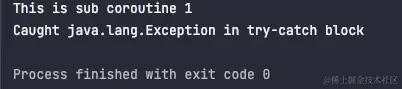 fun main() { val exceptionHandler = CoroutineExceptionHandler { _, exception -> println("Top-Level CoroutineExceptionHandler got $exception") } val coroutineContext = Dispatchers.Default + CoroutineName("ExceptionHandler")+exceptionHandler CoroutineScope(coroutineContext).launch() { try { coroutineScope{ launch { println("This is sub coroutine 1") throw Exception() } launch { println("This is sub coroutine 2") } launch { println("This is sub coroutine 3") } } } catch (exception: Exception) { println("Caught $exception in try-catch block") } } Thread.sleep(100) }运行一下。