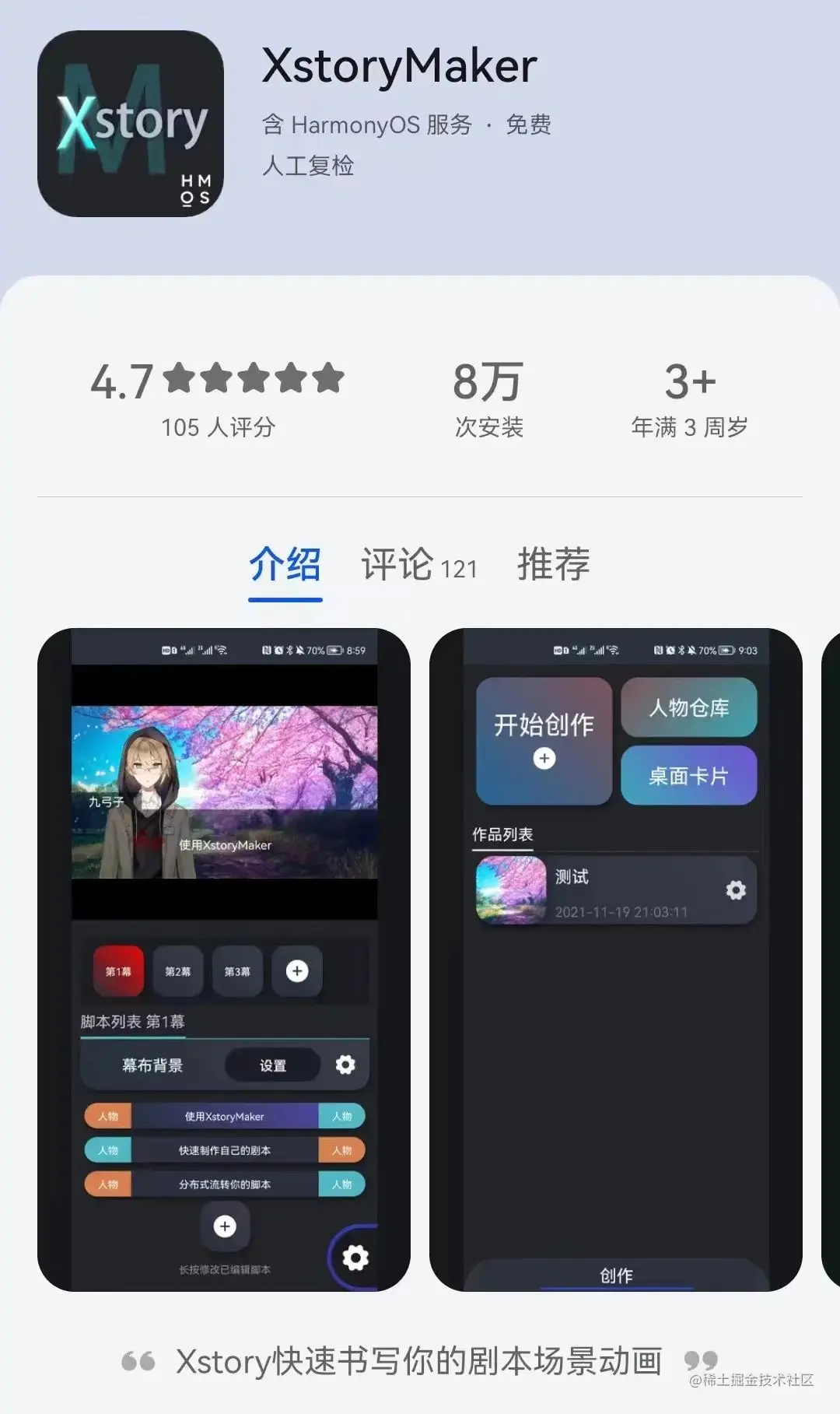 我个人比较喜欢玩天黑请闭眼、狼人杀之类的推理游戏,做这个APP的初衷其实是想做一个工具,让视觉小说这种表达形式工具化。APP上架到华为应用市场后,受到用户们广泛好评,下载量超8万,评分达4.7分。