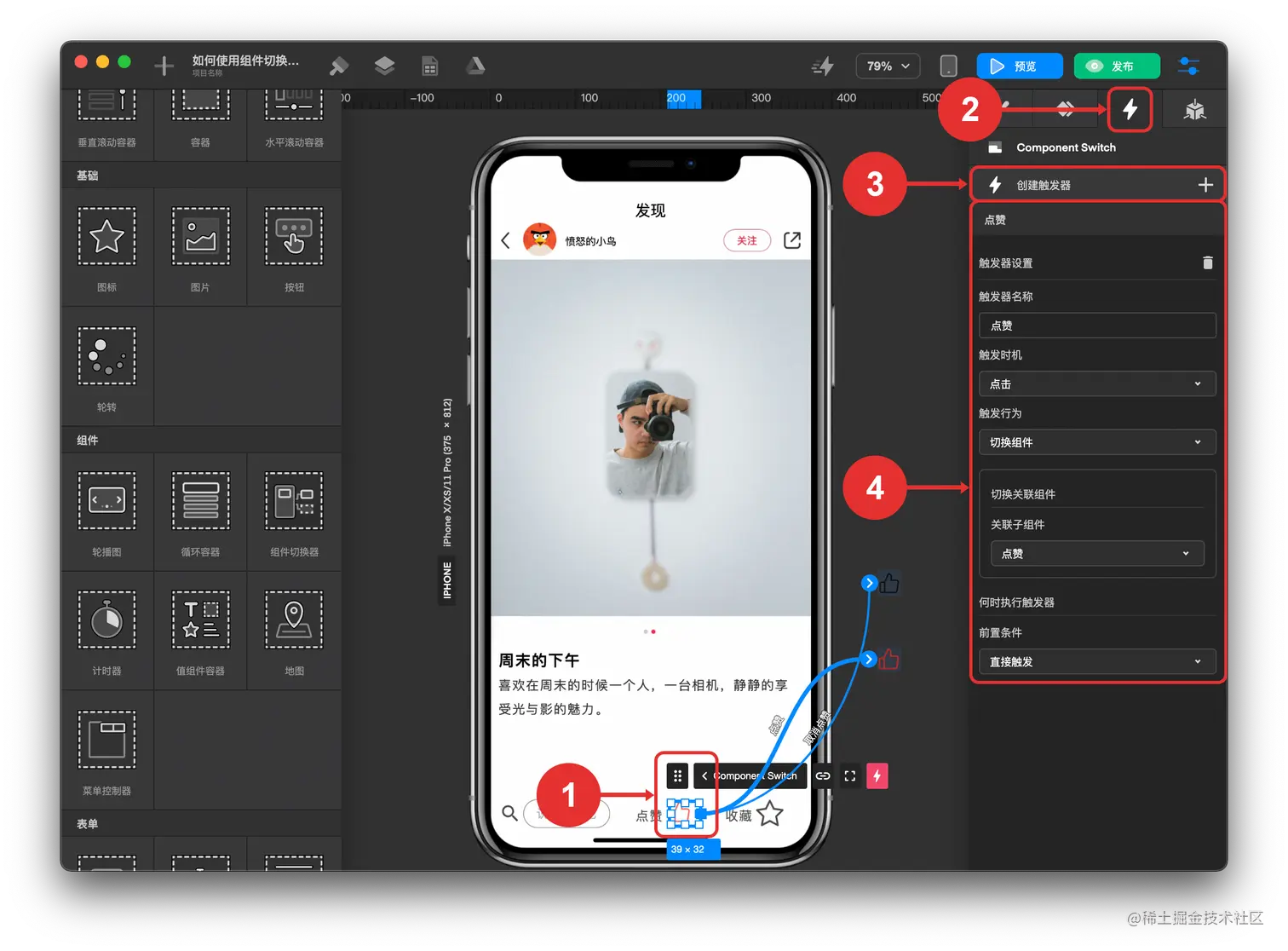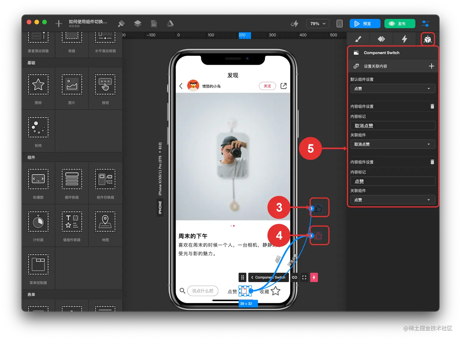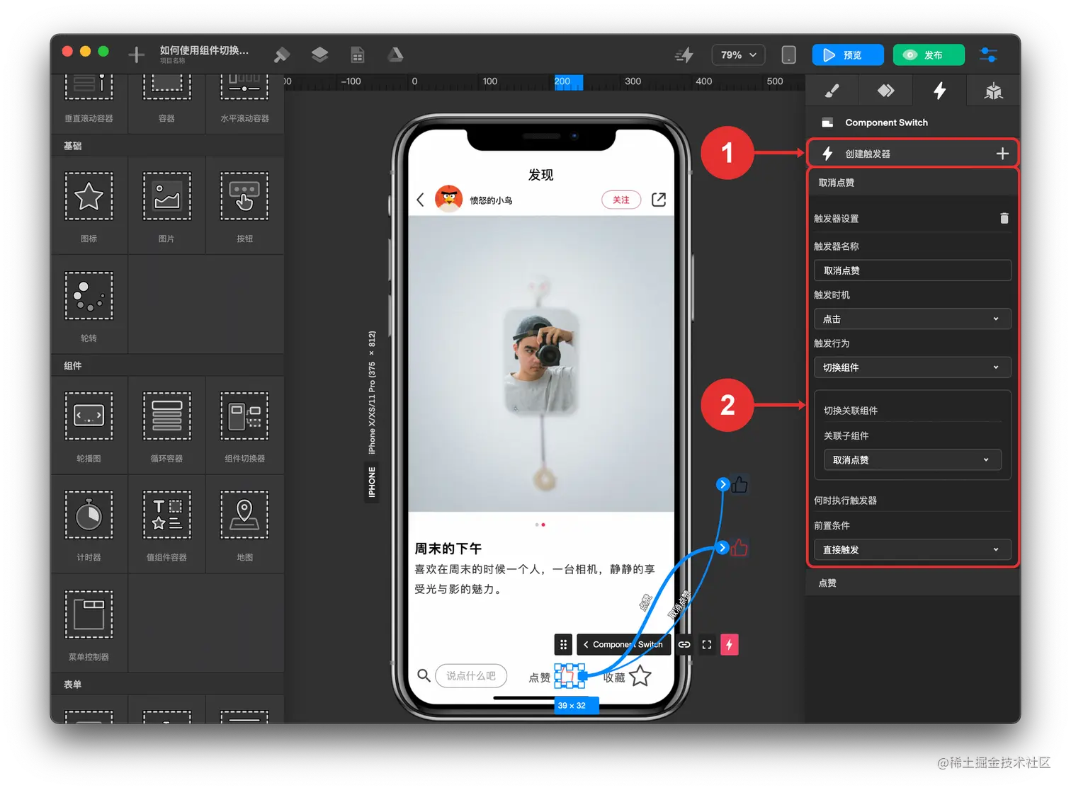 如果需要完成某个组件切换类的交互体验,例如配置“点赞”功能时,可以使用 组件切换器 实现这一目的。