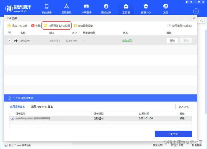 IPA 签名工具目前没有自动安装功能,签名完成后需要手动“打开已签名 IPA 位置”,然后双击使用爱思助手安装。