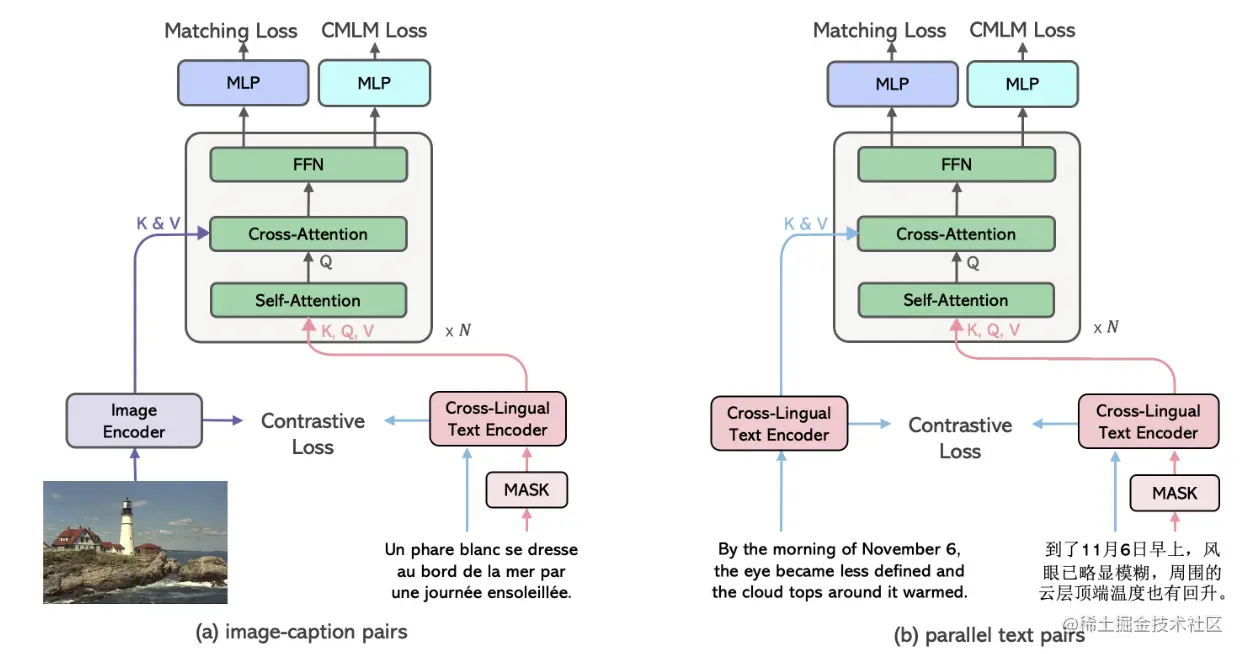 论文简介:To this end, the cross-view language modeling framework considers both multi-modal data (i. e., image-caption pairs) and multi-lingual data (i. e., parallel sentence pairs) as two different views of the same object, and trains the model to align the two views by maximizing the mutual information between them with conditional masked language modeling and contrastive learning./为此,跨视图语言建模框架将多模态数据(即图像-标题对)和多语言数据(即平行句子对)视为同一对象的两个不同视图,并通过条件掩码语言建模和对比学习,使两个视图之间的相互信息最大化来训练模型,使其协调一致。