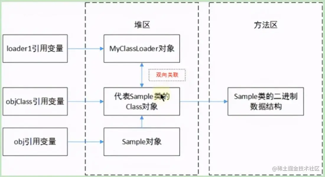 我们知道,对象被回收的条件是这个对象没有被引用,类也是如此,在类被加载到内存后,它会在堆中创建一个 Class 对象,并且和加载它的加载器互相关联,也就是图中的 MyClassLoader,而这个对象也和类对应的实例对象所关联,这种关联是无法切断的,而如果对应的三种变量都没有再引用,那么就相当于这个类信息没有被引用,那么也就可以被回收了。