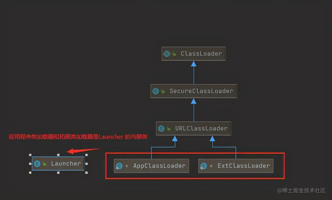 SecureClassLoader 扩展了 ClassLoader,增加一些方法,但是一般我们使用的是其子类 URLClassLoader,URLClassLoader 实现了 ClassLoader 很多抽象方法,如 findClass()、findResource() 。 我们在编写自定义类加载器时,如果没有特别复杂的实现,可以直接继承 URLClassLoader ,这样可以避免自己编写 findClass 以及获取字节流的方式,使自定义类加载更加简洁 。而拓展类加载器与系统类加载器也是继承 URLClassLoader 。