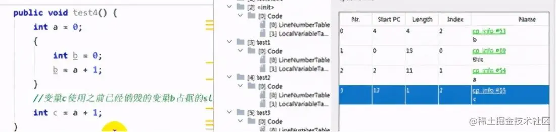 上面这个方法是实例方法,包含 this, 应该有四个 index 槽位 ,但是因为 b 是在括号里作用的,出了括号就失效了,所以它的位置(index=3的位置)被新设置的 c 所占用。