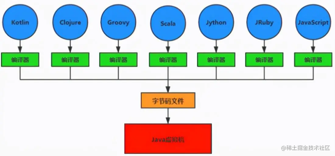 第二点就是 JVM 是 " 跨语言 " 的,因为 JVM 只认 class 文件,所以其他语言只需要一个编译器编译成 class 文件就可以使用 JVM 来编译执行了。
