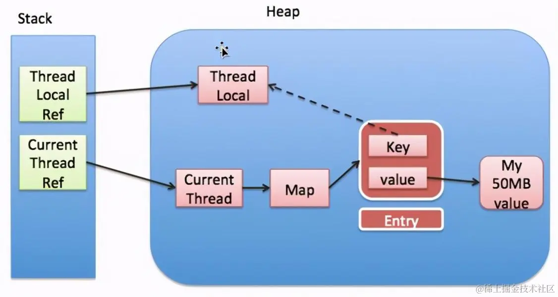 我们重点看一下下面这条链路:Thread Ref → Current Thread → ThreadLocalMap → Entry → Value → 可能泄漏的value实例。