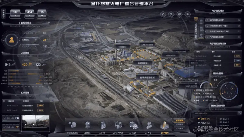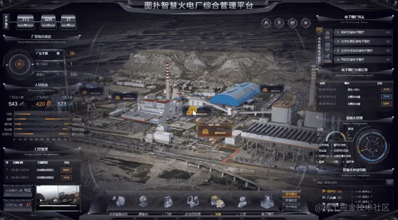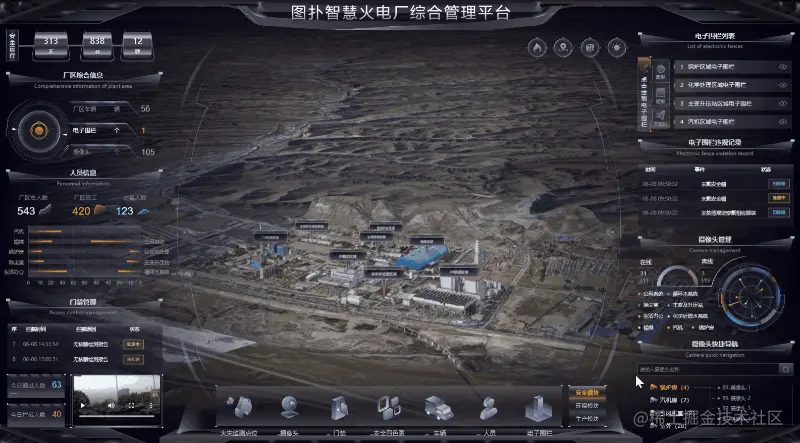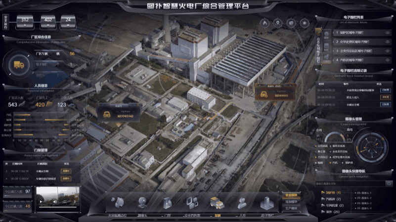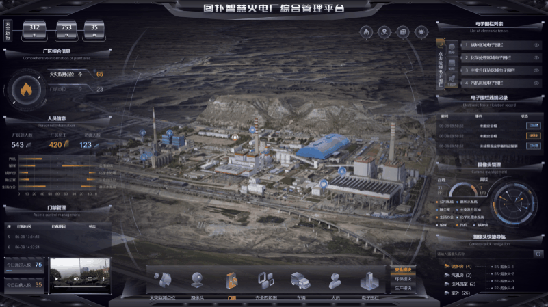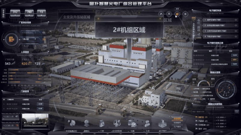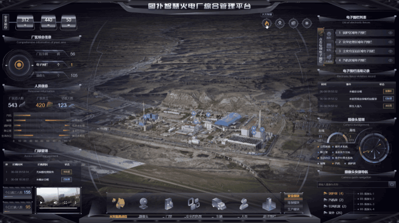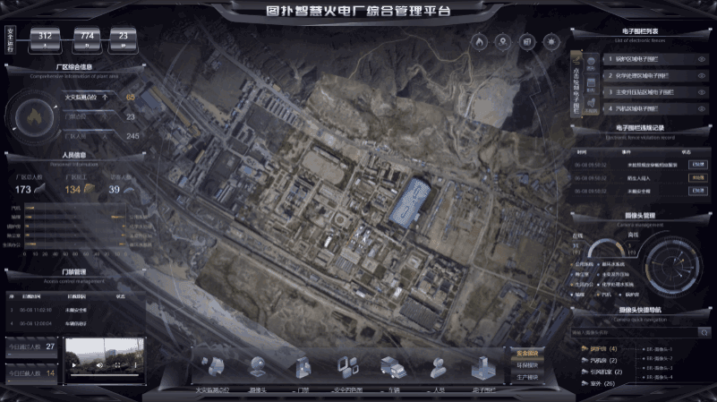 火电厂的 3D 界面内用黄色表示厂区的各个电子围栏位置,并在人员入侵时弹出提示框,提醒集控中心运维及时通知入侵者离开。利用图扑软件 2D 面板显示违规记录,如违规时间、事件、处理状态,后续有针对性地加强管理。点击面板中电子围栏后的小眼睛可将镜头拉近查看,也可根据需要手动绘制电子围栏区域。