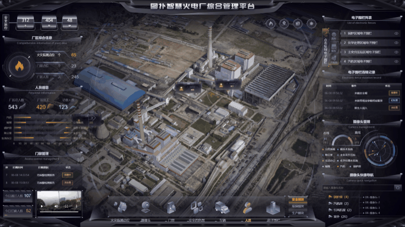 第一人称视角漫游可带来沉浸式体验。无人机视角漫游从空中漫游查看,展示火电厂的宏大,带来震撼观感。满足不同类型资产的运维管理特性。