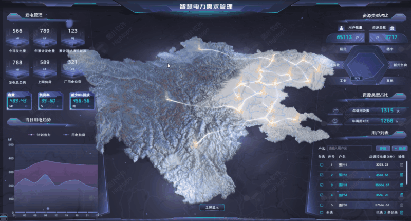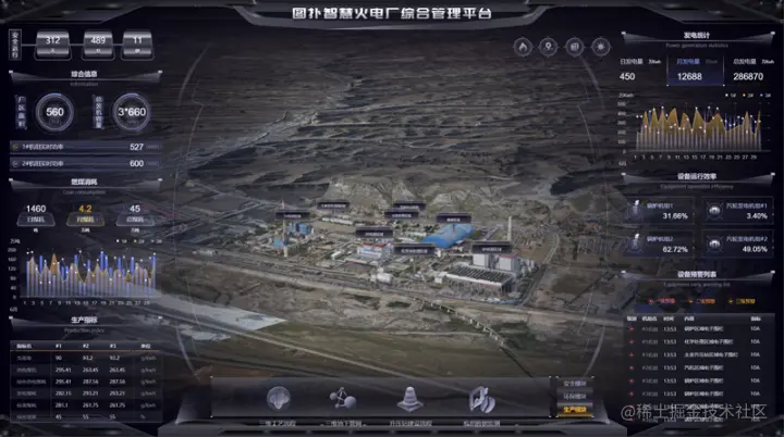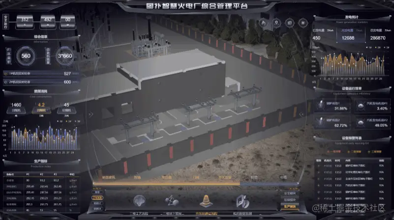 图扑软件将 2D 和 3D 无缝融合,通过图表的数据绑定,利用不同样式的图表统计方式统计安全运行天数、厂区面积、总装机容量、机组实时功率;日发电量、月发电量、总发电量数据;供电煤机、发电煤耗、负荷率等生产指标;锅炉机组和汽轮发电机组等设备运行效率。采用柱状图和折线图结合的方式展示日煤耗、月煤耗、总煤耗,了解厂区基本运行状况,保证火电厂运行的安全性、经济性和电能的质量。