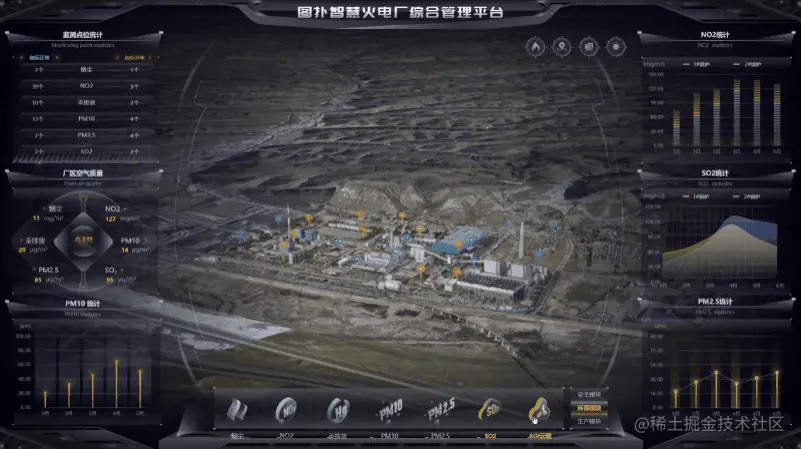 对于智慧火电厂而言,仿真建模展示远不能满足需求。利用图扑软件结合 GIS 进行人员、车辆、设备的定位、监控管理,分析各类监控点位的布控合理性,全面监控厂区的生产状态,才是厂区智能化转型的重点。在安全方面,对厂区、消防设备等进行数字孪生;在环保方面,对 NO2、汞、PM2.5 等有毒有害物质排放情况进行分析,指导火电厂的环境治理工作,促进厂区的绿色化转型。
