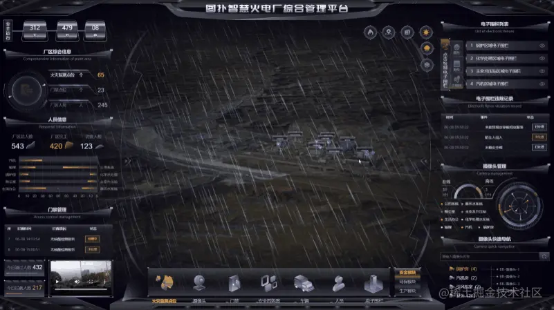 基于 HT for Web 和 GIS 技术的智慧火电厂通过获取三维场景数据实现火电厂的数字孪生。基于数字孪生的三维技术,将物联网、人工智能、大数据等新 ICT 技术进行整合,对火电厂安全模块、环保模块、生产模块进行全方位的数字化建设,建设成新一代科技、高效、安全、绿色、健康的火电厂。基于天气数据进行气象仿真,根据具体的需求,展现雨、雪等不同的气象数据三维仿真效果。也可接入气象数据,在恶劣气候来临前做好应对措施。