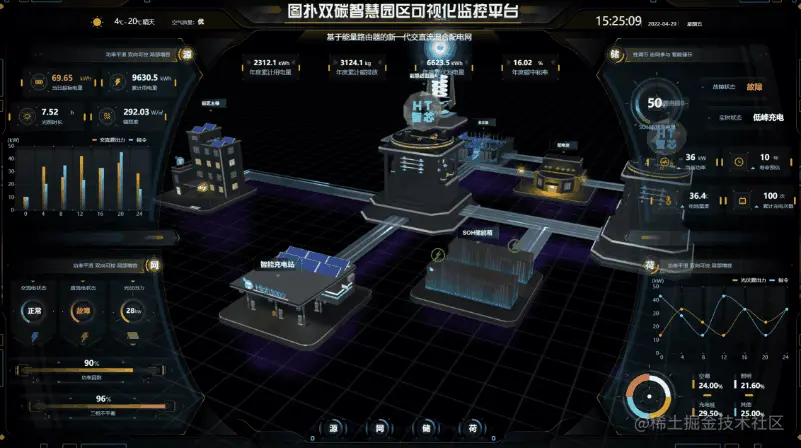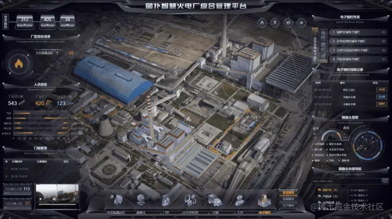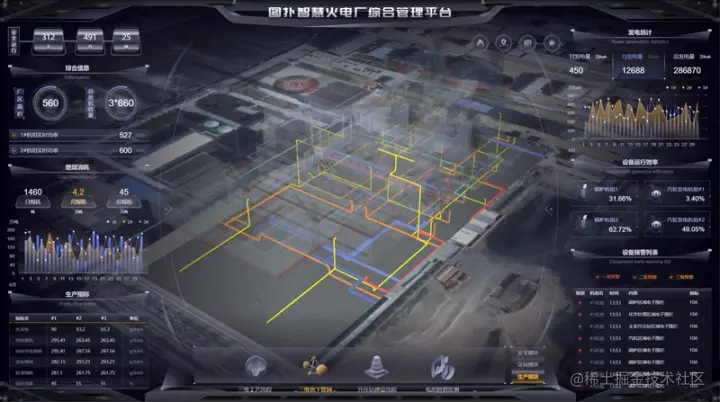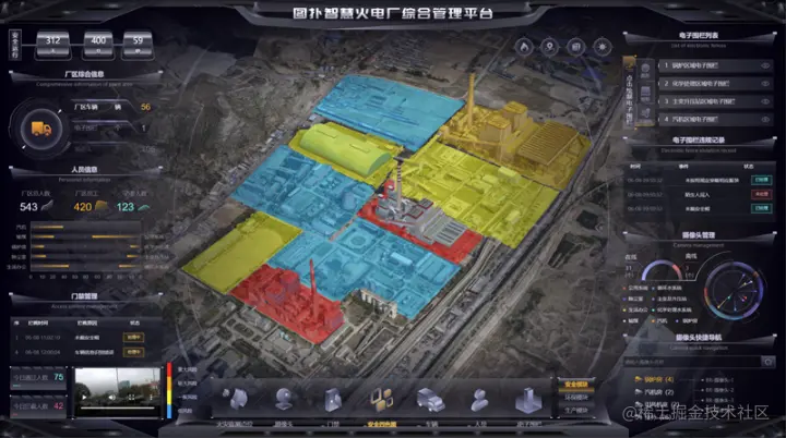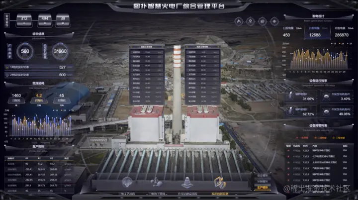 煤电作为火力发电的一种,通过煤在燃烧时产生的热能,将发电动力装置转换成电能。采用图扑软件的 2D、3D 和 GIS 可视化技术结合倾斜摄影和数字孪生技术,搭建出火电厂不同机组区域、输煤区域、化学水处理区域、公用系统区域、生活办公区域、主变及升压站区域的三维可视化系统。利用泛在感知、自适应、智能融合与互动化,让火电厂在工程设计、生产调度、过程监控、故障诊断、运营管控、可视化运维等不同环节实现智慧管理。