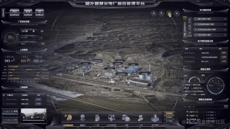 点击 3D 场景底部摄像头图标可查看厂区智能摄像头分布,把摄像头叠加 AI 的算法,能够进行人员行为和物体的识别,让普通摄像头会思考。可视化界面接入监控系统,显示当前厂区场景。