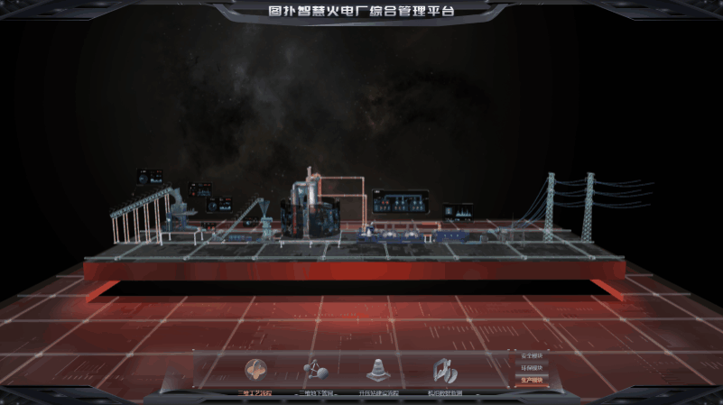 采用三维组态的方式实现电厂关键工艺流程上的设备连接,一方面可监控重要设备的运行信息;另一方面,用三维组态展示出燃煤发电厂的主要发电工艺:输煤栈桥→筛煤机→碎煤机→输煤皮带→给煤机→磨煤机→锅炉→汽轮机→发电机→主变→升压站→电网……