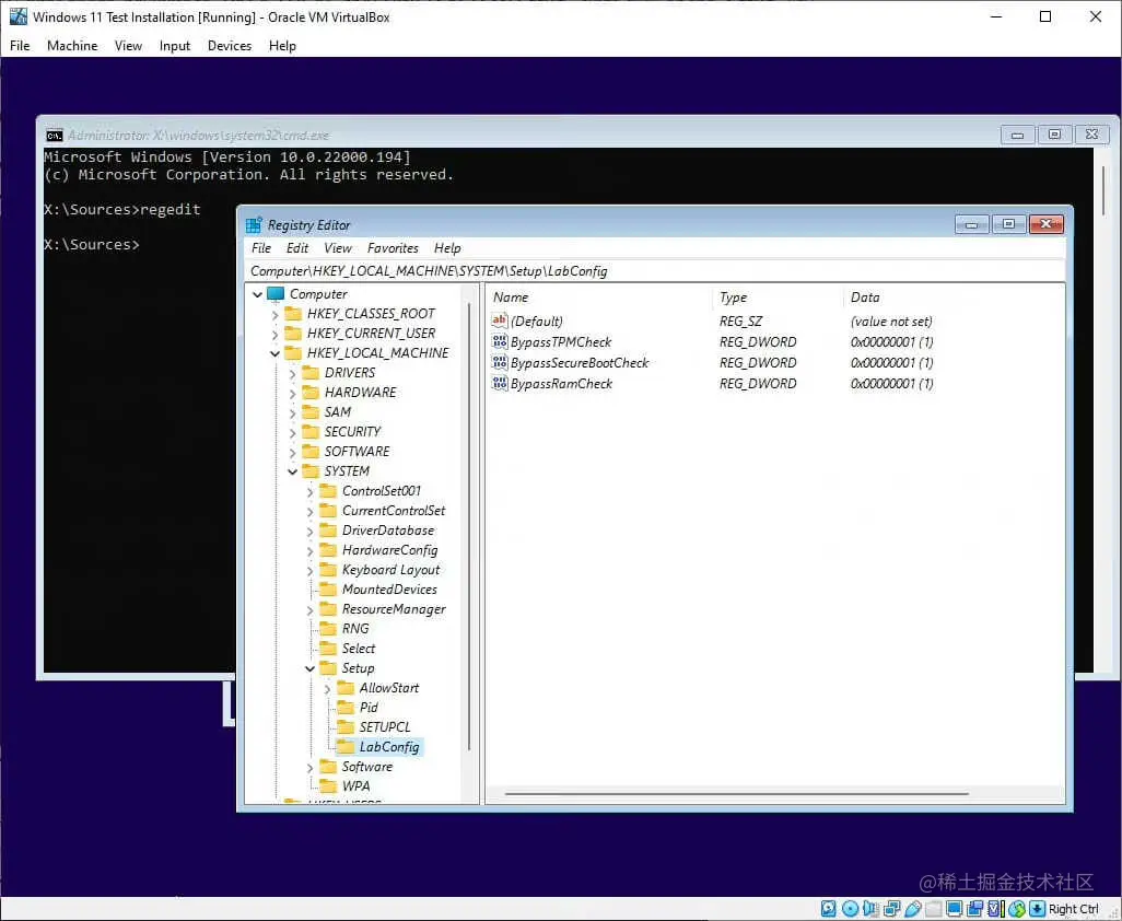 在安装界面按下 shift + f10,在弹出的命令行里输入 regedit 进入注册表。