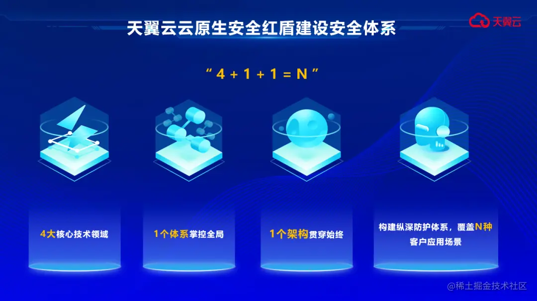 天翼云科技有限公司安全专家林顺东表示,天翼云以“4+1+1=N”为理念,基于云原生底座将安全能力整合至统一的安全平台,深耕云原生业务应用安全、网络安全、数据安全、云原生安全4大核心技术领域,打造一体化云安全可信运营体系和零信任架构,构建安全核心能力自主可控的技术壁垒。
