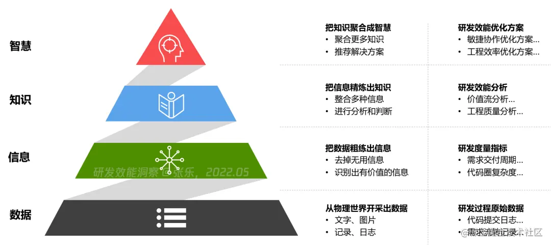 **这个模型可以帮助我们很好地理解数据、信息、知识和智慧之间的关系。**最下层是「数据」,数据是对物理世界的刻画,代码提交的原始日志、需求流转的信息等这些都是数据;有些数据需要经过鉴别才拥有价值,所以第二层我们把它称为有价值的「信息」;如果只有片面的信息还不够,并不足以去回答一个复杂的问题,我们需要再把多种信息进行聚合加工,辅以分析判断,达成理解,这就是第三层「知识」;然而,我们最终目的是做出效能改进,所以在多个知识的积累之上,我们运用专家的经验来生成解决方案,把知识聚合成最上层的「智慧」。