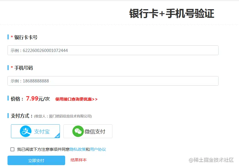 银行卡四要素验证:姓名+身份证号+卡号+手机号码