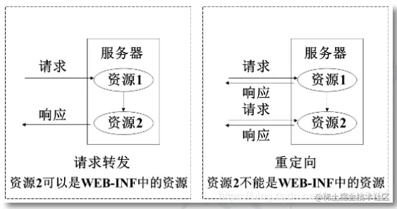 注意,对于请求转发的页面,可以是WEB-INF中页面;而重定向的页面,是不能为WEB-INF中页的。因为重定向相当于用户再次发出一次请求,而用户是不能直接访问 WEB-INF 中资源的。