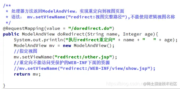 在处理器方法返回的视图字符串的前面添加 redirect:,则可实现重定向跳转。